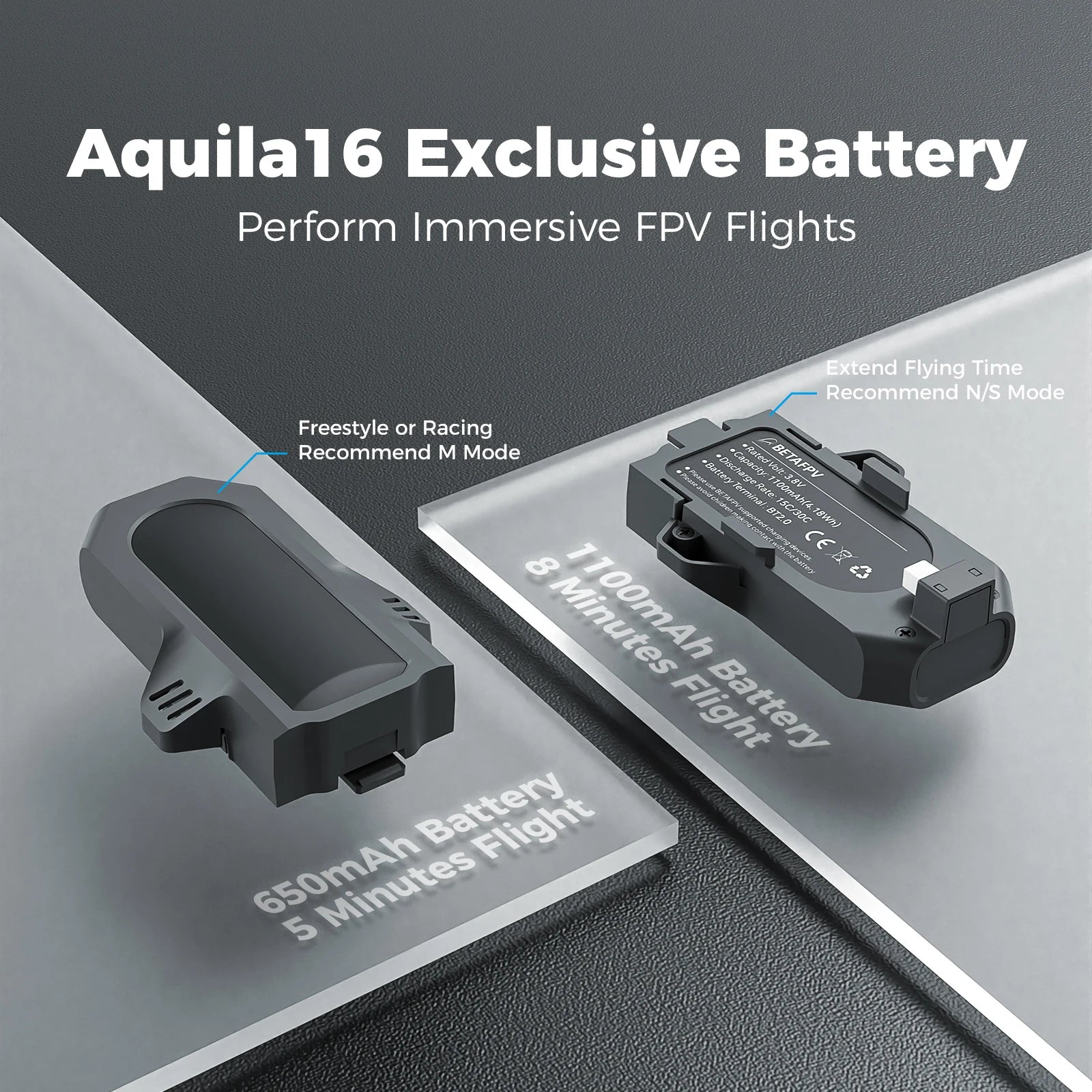 The Aquila16 FPV Kit comes with a default 1100mAh battery, ideal for beginners seeking a smooth flying experience in N/S mode. However, for those looking to advance their freestyle and racing flight skills in M Mode,the 650mAh version batteryis more suitable, it needs to be purchased separately.